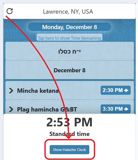 To display the Halachic clock, launch the MyZmanim app, then tap the button Show Halachic Clock as shown below: